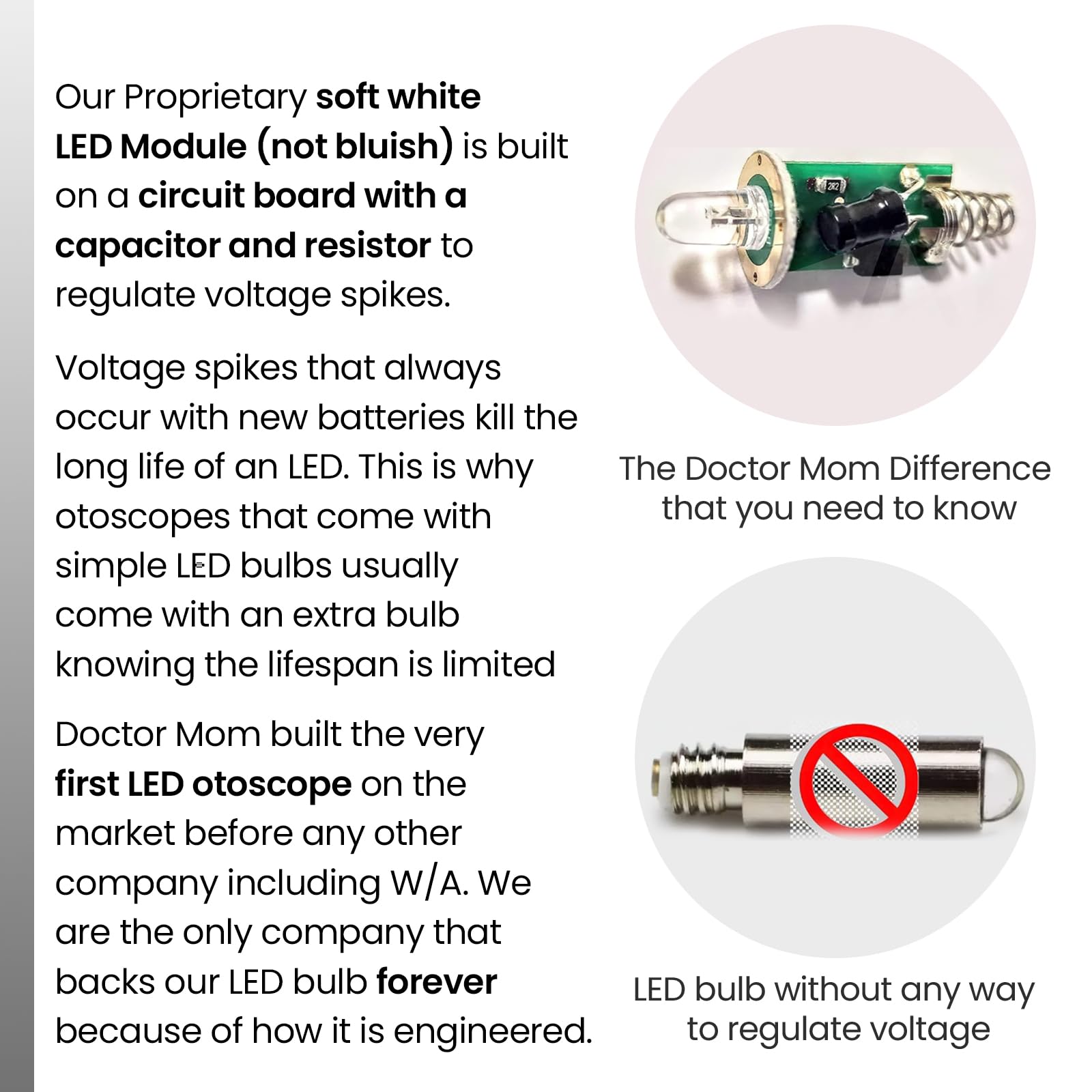 · READY & RELIABLE: Not All Otoscopes Are Created Equal - Be Sure to Choose Wisely! Stop wasting tons of money on unreliable otoscopes that either don't work or are difficult to use. Designed by an experienced ER physician, the 4th Generation Doctor Mom LED Otoscope combines superior quality, functionality, and an attractive price.