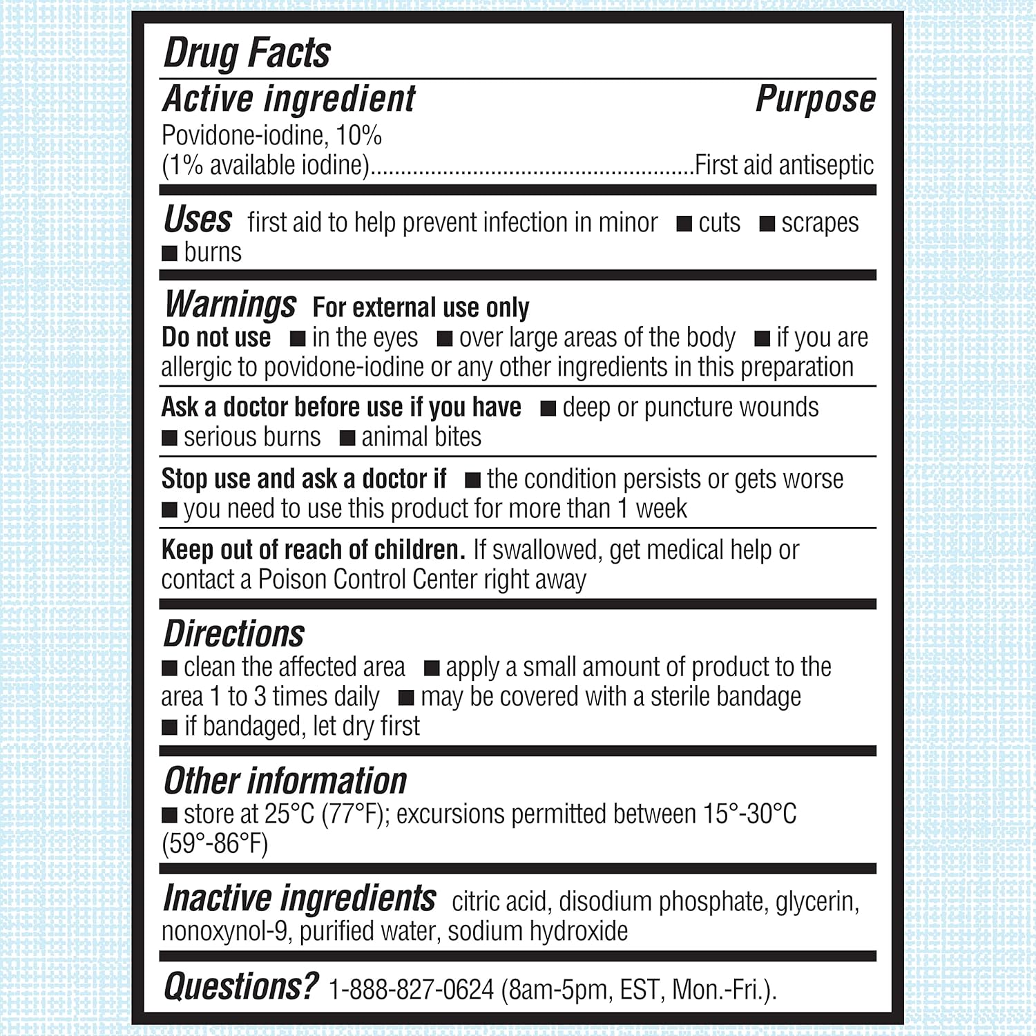 10% Povidone Iodine Antiseptic: Betadine First Aid Solution is a 10% povidone-iodine aqueous solution that quickly kills germs in minor cuts, scrapes, and burns. Packaging may vary.