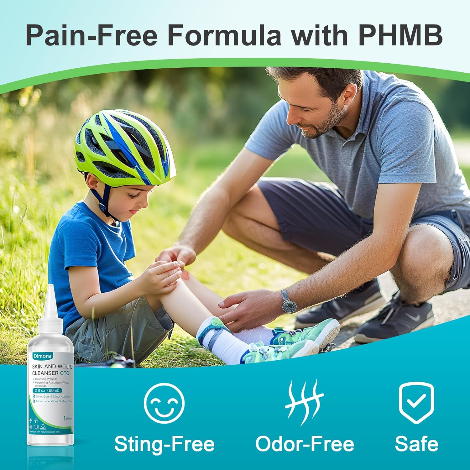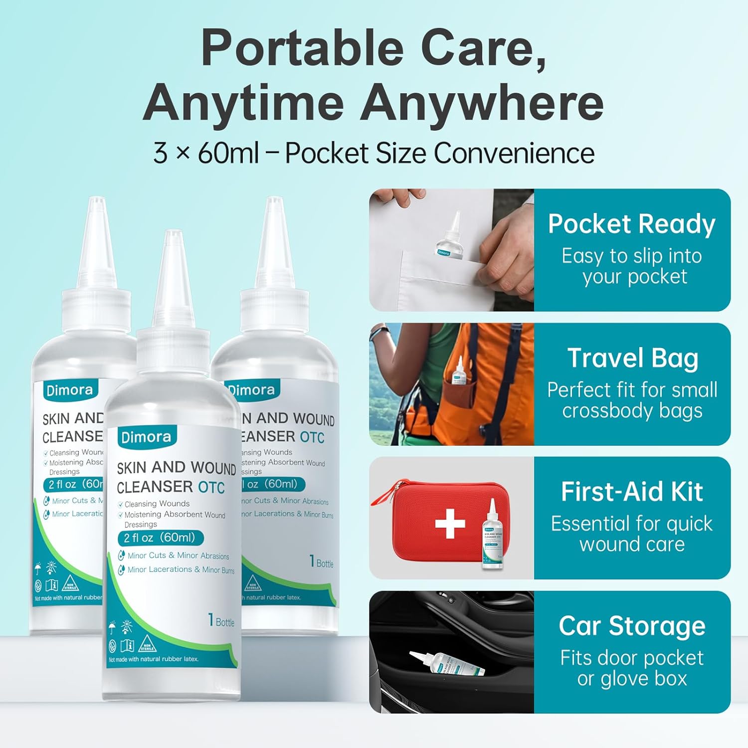 Dimora 3-pack pH-balanced wound wash: 2oz portable bottles for home, sports & outdoor first aid. Alcohol/iodine-free, odorless, irritation-free. Safe for 8 weeks post-opening & long-term use—ideal for cuts, abrasions & dressing care.