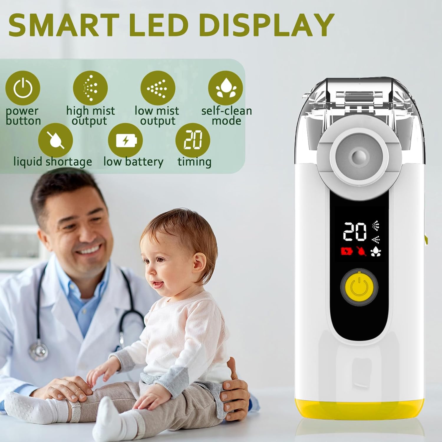 Rechargeable lithium-ion atomizer: 3-hour full charge for 6-hour runtime. 3 intuitive LED timing modes (10/20 mins misting, 5 mins self-cleaning) with ultra-silent operation. Easy to clean & use, perfect for gentle saline aerosol administration, especially for kids.