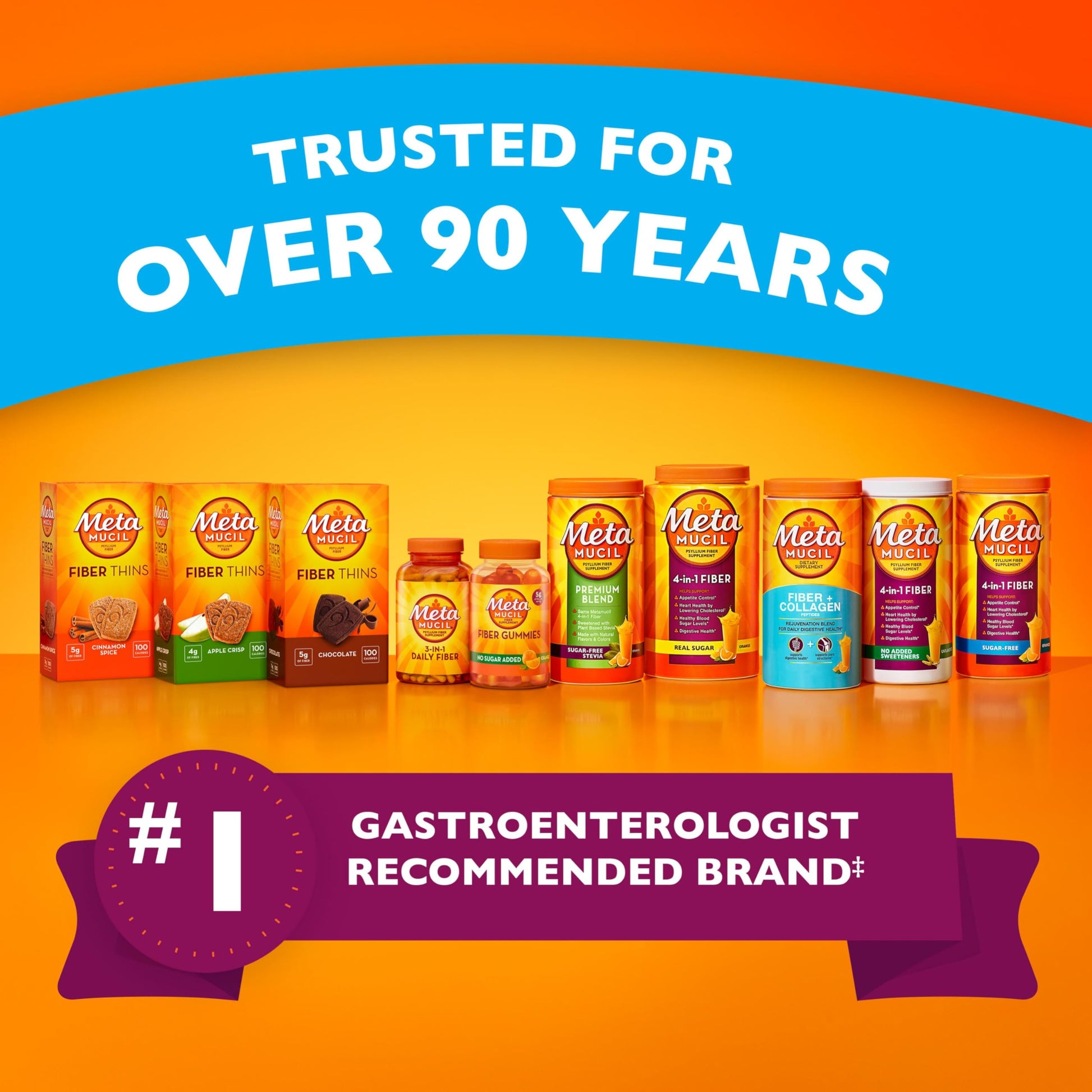Metamucil: #1 doctor-recommended fiber brand trusted for 90+ years. The only leading brand with psyllium husk for 4-in-1 benefits: digestive health, cholesterol-lowering heart support, healthy blood sugar & appetite control. Smooth orange powder with real sugar closes your fiber gap.